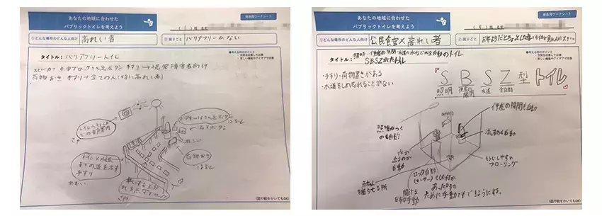 みんなで話し合って高齢者や赤ちゃんを連れた人、子どもなど様々な使用者に配慮したアイデアが盛り込まれたワークシートが出来上がりました。