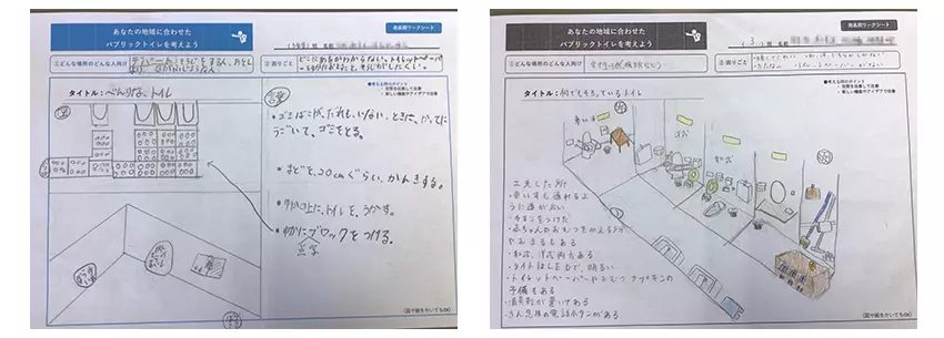 教材はパブリックトイレをテーマとしたユニバーサルデザインや多様性を学ぶプログラム「みんなにやさしいパブリックトイレを考えよう!」です。事前に先生から授業を受けた後に班に分かれてグループワークを行い、理想のパブリックトイレをワークシートに記入してもらいました。