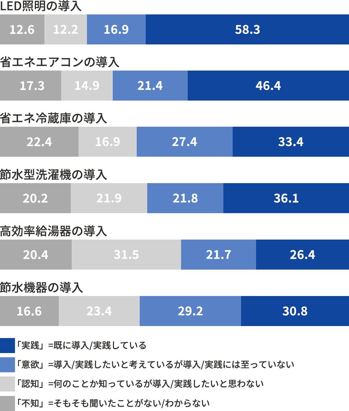 「住まい」の回答をみると、照明やエアコンについては、約半数の方が導入しています。それに比べて冷蔵庫・洗濯機・節水機器や給湯器については導入が約3割と遅れていることが分かります。