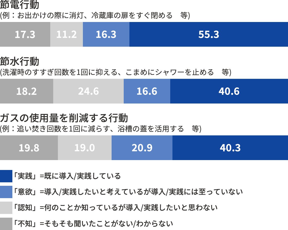 また、行動については、節電は半分以上の方が実践されており、節水や節ガスに比べて進んでいるようです。