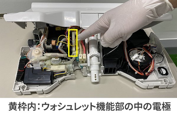 「ウォシュレット」への除菌水機能搭載に向けては、電極の小型化にも苦労しました。「ウォシュレット」はさまざまな機能の部品がギュウギュウに詰まっています。また、「ウォシュレット」はスリムなデザインにこだわっているので、大きな電極では「ウォシュレット」の形状そのものを変えることになるため、電極の小型化は必須だったのです。