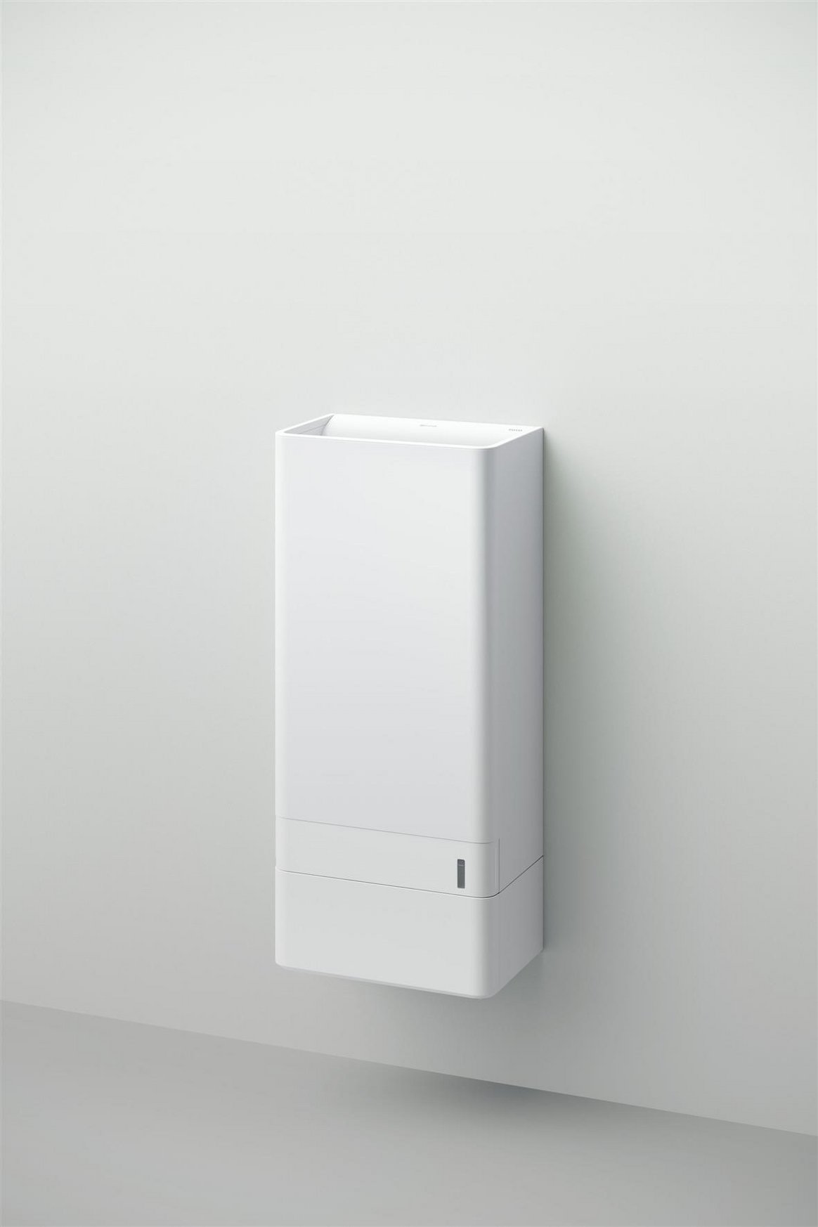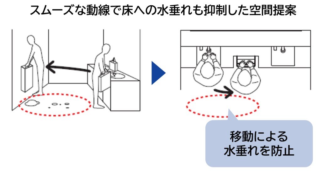 こうした機能追加をおこないつつ、商品サイズを最大限コンパクトに設計することで、ハンドドライヤーを洗面ボウル間にすっきり設置でき、手洗いから乾燥までスムーズな動線で床への水垂れも抑制した空間提案が可能となりました。