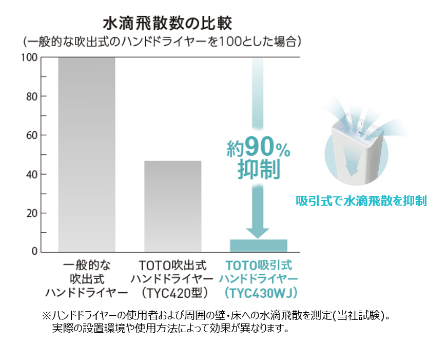 吸引式にすることで高速乾燥は維持しつつ、商品外への風の吹き返しや水滴飛散を抑制しています。一般的なハンドドライヤーに比べて、水滴飛散数を約90%低減しており、より衛生的に快適に使って頂けます。