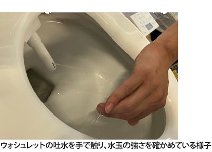 その他の吐水形態制御をした洗浄方式のひとつに2012年に誕生した「たっぷリッチ洗浄」があります。ワンダーウェーブ洗浄では、ポンプを使用していましたが、たっぷリッチ洗浄はポンプを使用しません。電気を使わず自然現象で水玉を作っています。こちらはお求めやすい価格帯のウォシュレットに搭載されています。
