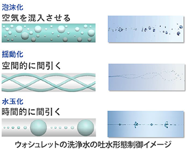 ウォシュレットのノズルから出てきた水を、狙い通りの“カタチ”に吐水をコントロールすることを「吐水形態制御」と言います。ノズルから出た水は後からコントロールできないため、ノズルから出るまでに水の出方を制御します。これにより、節水と洗い心地を両立させることが可能になりました。具体的には、空気を混入させたり、吐水を揺らしたりすることで、ボリューム感や洗浄感を向上させています。
