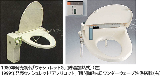 ウォシュレットは1980年の発売当初から、タンクに溜めた水を温めてから吐水する貯湯加熱式と、瞬間的に沸かしたお湯を吐水する瞬間加熱式の2種類がありました。瞬間加熱式は、貯湯するタンクがなくすっきりとしたデザインで、お湯を保温する必要がない省エネタイプなのですが、瞬間的に作れるお湯の量が限られており、洗い心地に満足をいただけない方もいたようです。