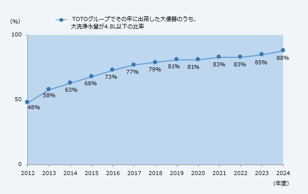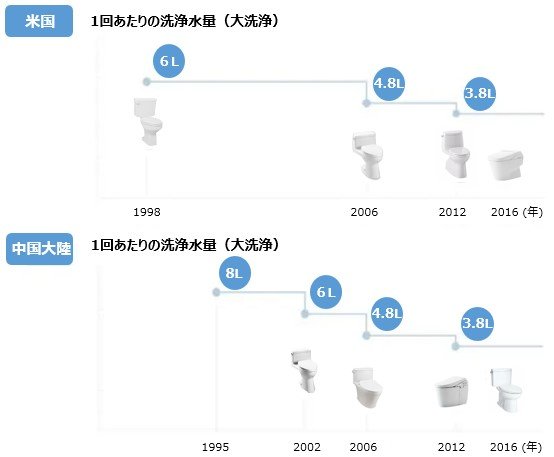 日本では、1976年に水洗便器の大洗浄の水量は1回あたり13Lとそれまでの便器に比べて35%節水を図り、その後2002年に、TOTOが世界に先駆けて開発したトルネード洗浄などで継続的に節水化を進め、2009年に4.8L便器、2012年には3.8Lの超節水便器を発売しています。