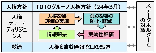 TOTOグループは、2023年度に制定した「TOTOグループ人権方針」に沿って、バリューチェーンを通じて事業活動の人権への負の影響を特定し、負の影響を防止・軽減していく「人権デュー・ディリジェンス」を推進しています。