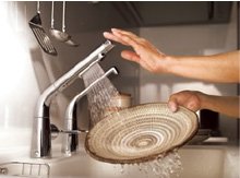 洗いものに当たった水がほうきのようにパッと広がる幅広シャワーで、汚れをすばやく流すキッチン用の「水ほうき水栓」。先端を軽くタッチするだけで水の出し止めができる、タッチスイッチの機能も搭載しています。空気を含ませたシャワー「エアイン®シャワー」の採用で、節水効果も高めます。