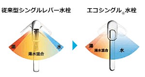 お湯と水の使い分けがきちんとできるよう、お湯と水の境をクリック感でお知らせする「エコシングル水栓」。レバー中央部までは給湯機が作動せず水が出るので、エネルギーの無意識なムダ使いを防ぎます。