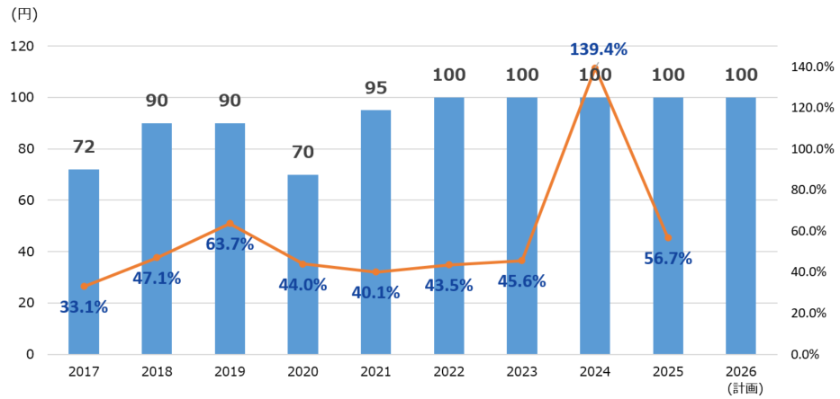 配当性向につきましては、親会社株主に帰属する当期純利益の40%以上とします。配当額につきましては、減配せず増配または維持とし、株主の皆様へ安定的な利益還元を行います。配当は、今後も中間・期末の年間2回を予定しております。