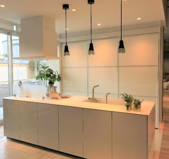 システムキッチン「ザ・クラッソ」は、透明感のあるTOTO独自開発の「クリスタルカウンター」が光を拡散させ、空間を明るく演出。シンプルで凹凸のないデザインは、キッチンとリビングとの美しい調和を実現します。