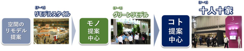 2004年度から2年毎に、時代に合わせたテーマ設定でTDY3社の最新のリモデル提案を、直接、お客様に訴求する場として大規模展示会を、東京・名古屋・大阪・福岡などの主要都市で開催してきました。今までに7回(延べ37会場)開催し、延べ52万人のお客様・工事店の方々に来場いただきました。