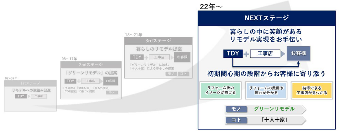 TDY3社の活動は、「暮らしの中に笑顔があるリモデルの実現」に向けて、初期関心期から決定期の各段階において、お客様へ安心できる情報提供を進めていきます。