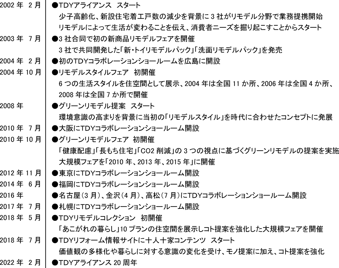TOTO、DAIKEN、YKK AP(以下、TDY)の3社は、リモデルの空間提案を強化しお客様へ期待以上に満足していただける快適な住空間を提供するために、2002年2月、商品企画・開発や販売支援体制などでTDYアライアンスとして提携し、今年2月に20周年を迎えました。