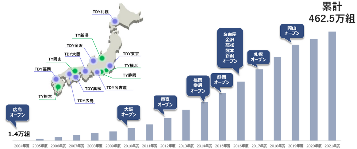 2004年2月に広島で初のTDYコラボレーションショールームを開設し、17年間で全国13か所までに広げて情報を発信してきました。3社合同のイベントやリモデルクラブ店主催のイベントなどを開催し、17年間で累計462.5万組のお客様にTDYの商品をご提案してきました。