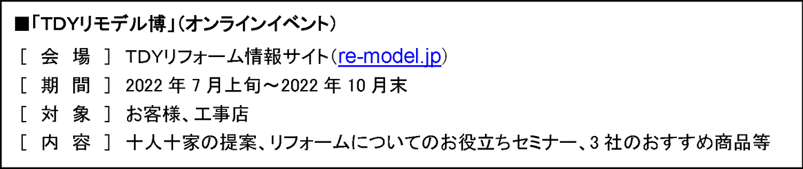 また、2022年7月には、TDY初のオンラインイベント「TDYリモデル博」を開催し、イベント期間内の10月末までに15万人の来場者を目指します。同時に2022年7月末と8月末に、商品の機能を実際に体感いただけるイベントとして、全国13か所のTDYコラボレーションショールームでショールームフェアを開催※し、TDY3社のおすすめ商品の提案などを行います。