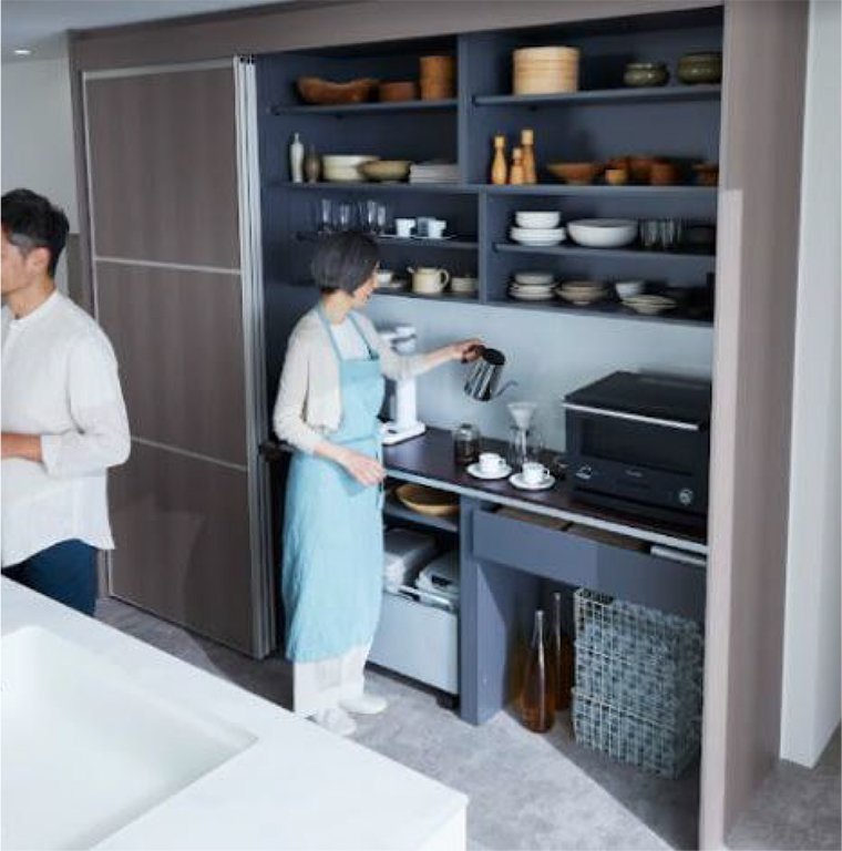 「コンフォートユニット」は扉を開ければ、自由度の高 い大容量の収納キャビネットとして機能し、作業動線も考慮されたカウンターで作業しやすい設計になっています。キッチンの後ろで料理の盛り付けをしたりコーヒーをいれたり、ちょっとした作業もカウンターで行えるのでとても便利です。また、手の届きやすい目線の高さで取り出しやすい棚を設けており食器の出し入れもスムーズです。また、おうち時間が増えたことで多くなったストック品も箱のまま収納が可能で、収納力と作業性を兼ね備えた周辺ユニットとなっています。