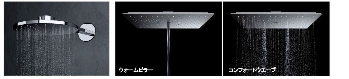 さまざまな建築空間に溶け込むよう水平垂直を基調とした美しいデザインとしています。段差や凹凸を極力なくした散水板は、視覚的にもたっぷりとした浴び心地が感じられるよう、規則性のあるノズルレイアウトとし、流れる水の形状まで美しくデザインしています。また、独自の吐水モードを搭載しています。