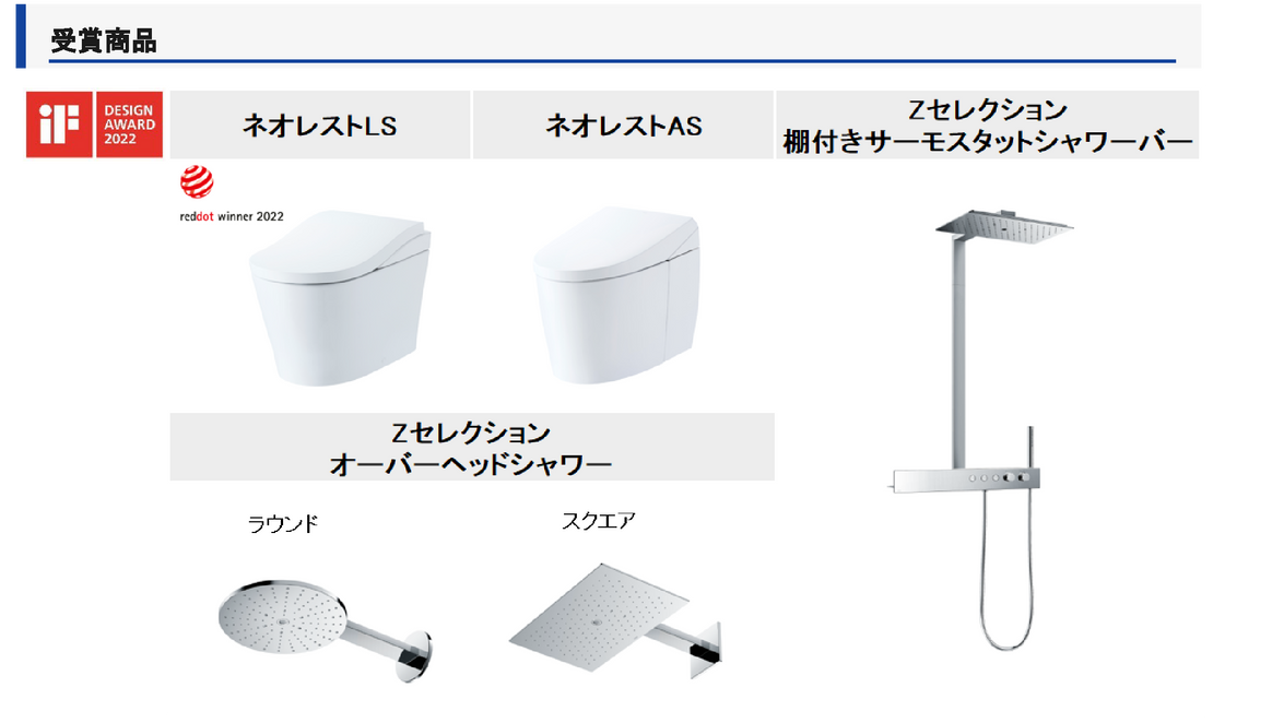 TOTO株式会社(本社:福岡県北九州市、社長:清田 徳明)のウォシュレット※1一体形便器「ネオレストLS」「Zセレクション オーバーヘッドシャワー」など5点が、国際的に権威のある『iFデザイン賞※22022』を受賞しました。「ネオレストLS」は、「レッドドット・デザイン賞※3」に続きダブル受賞となりました。