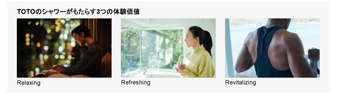 また、TOTOのシャワーがもたらす体験価値を、新たに「Relaxing」「Refreshing」「Revitalizing」の3つのキーワードで表現。“TOTOのシャワーがある暮らし”の生活シーンを描き、グローバルに訴求していきます。