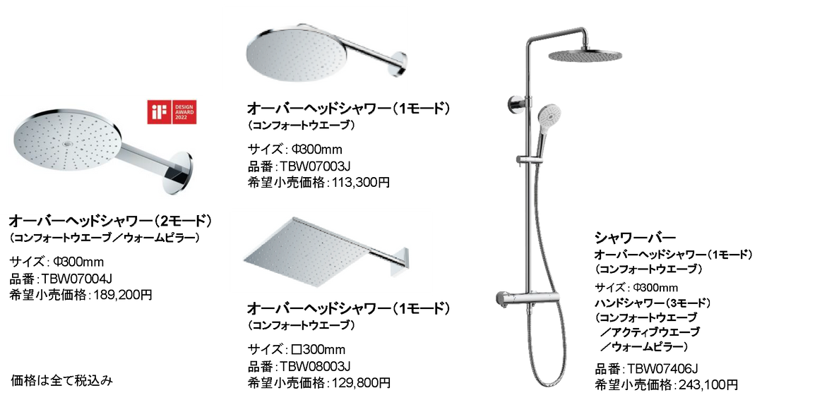 「棚付きサーモスタットシャワーバー」もモデルチェンジ。オーバーヘッドシャワーの散水板の意匠性の向上と、吐水モードに「コンフォートウエーブ」を追加します。