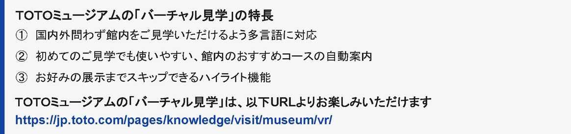 今回の「バーチャル見学」は、TOTOミュージアムへ直接来館するのが難しいお客様にも同様に見学いただくことを目的に、館内を3D撮影してバーチャル空間化したものです。これによって、さらに多くのお客様にTOTOミュージアムを知っていただくことが可能になりました。また、多言語対応※2や自動案内機能などの見学オプションも充実しています。