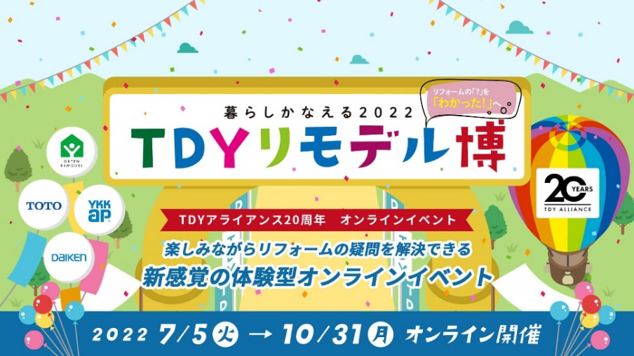 TOTO、DAIKEN、YKK AP(以下、TDY)の3社は、お客様が思い描く“暮らしの想い”を叶えるリモデル提案や暮らしに役立つ情報を発信する、TDY初のオンラインイベント「暮らしかなえる2022TDYリモデル博」(以下、「TDYリモデル博」)を7月5日~10月31日の期間で開催します。また、対面型イベントとして、実際の商品やさまざまなコンテンツでリモデル提案を行う「TDYコラボレーションショールームフェア」を各地のショールームで開催します。(各ショールームにより開催日は異なります。)