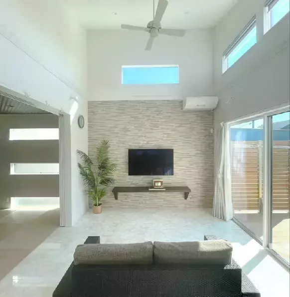 鏡面調仕上げの床材を採用した開放感のあるリビングに、石材を模した壁材がアクセントになっています。新たにリフォームで追加された温かみのあるウッドデッキが奥行きを演出しており、より洗練された暮らしの豊かさをお住まいに感じます。(壁材・床材:DAIKEN、窓・デッキ:YKK AP)