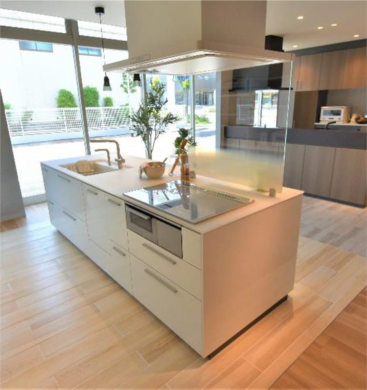 システムキッチン「ザ・クラッソ」は、透明感のあるTOTO独自開発の「クリスタルカウンター」が光を拡散させ、空間を明るく演出。シンプルで凹凸のないデザインは、キッチンとリビングとの美しい調和を実現します。