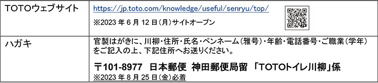 TOTO株式会社(本社:福岡県北九州市、社長:清田 徳明)は、第19回「トイレ川柳」を、2023年6月12日(月)から8月25日(金)まで募集します。