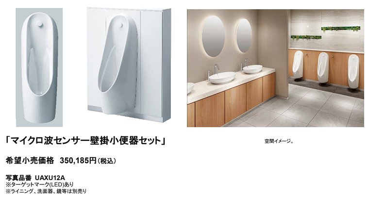 TOTO株式会社(本社:福岡県北九州市、社長:清田 徳明)は、心安らぐ印象のパブリックトイレ空間に溶け込む、小便器の最上位モデル「マイクロ波センサー壁掛小便器セット」を8月1日(火)に発売します。従来の直線基調のシャープな器具デザインに加え、曲線基調のやわらかなデザインを新たに品揃えすることで、器具選定の選択肢が増えます。シンプルな印象の空間から、安らぐ印象の空間までさまざまなパブリックトイレ空間にマッチします。