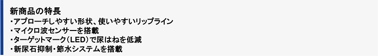 従来から好評の青色LEDのターゲットマーク照射による尿はね低減に加え、洗浄水量の削減と尿石の発生抑制を両立する「新尿石抑制・節水システム」も搭載しています。