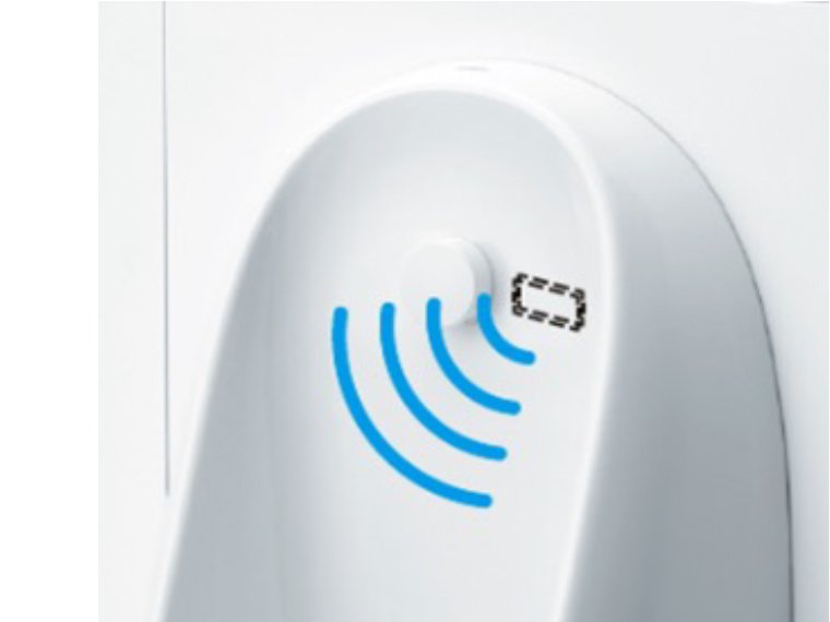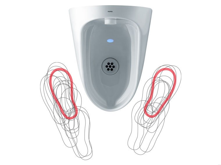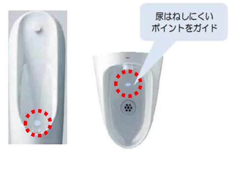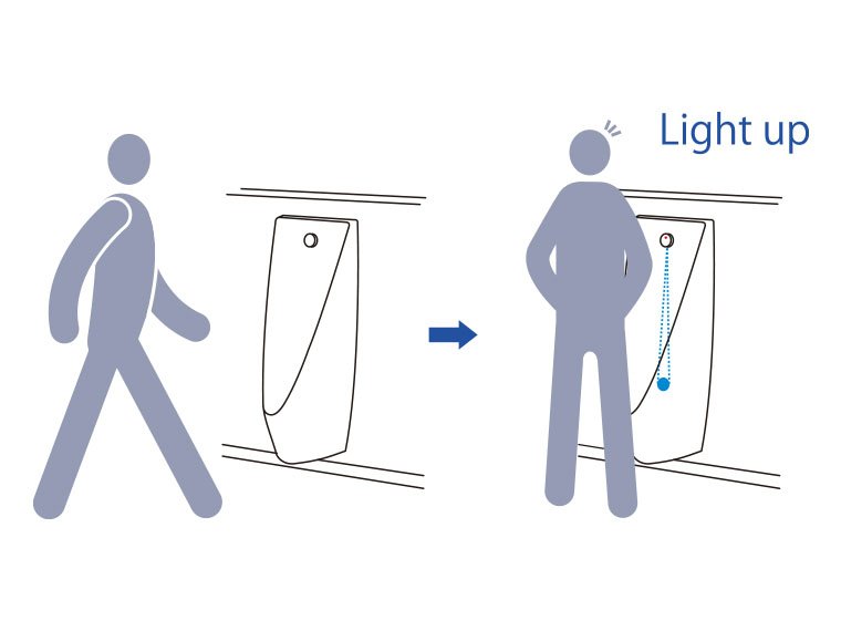 人が近づき、小便器の前に立つと尿はねしにくいポイントに青色LEDのターゲットマークを照射。“おもてなし”の演出に加え、はねにくいポイントに誘導することで尿はねや飛び散りを低減。小便器まわりの衛生性向上をサポートします。