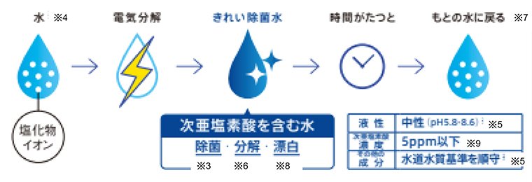 「きれい除菌水」※3は、水※4に含まれる塩化物イオンを電気分解して作られる除菌成分(次亜塩素酸)を含む水です。薬品や洗剤を使わず、水から作られます。次亜塩素酸は安全性の観点から水道水質基準※5の範囲内の濃度で作られており、安全※6で、さらに時間がたつともとの水に戻る※7ので環境にやさしいのが特長です。