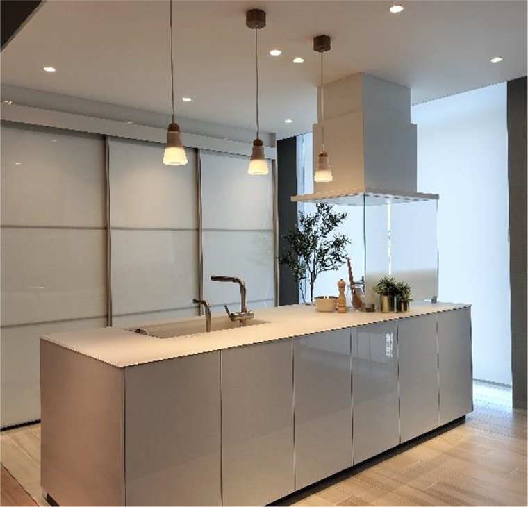 システムキッチン「ザ・クラッソ」は、透明感のあるTOTO独自開発の「クリスタルカウンター」が光を拡散させ、空間を明るく演出。シンプルで凹凸のないデザインは、キッチンとリビングとの美しい調和を実現します。
