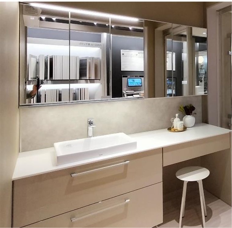 システムドレッサー「エスクア」は、セミオーダー感覚で洗面空間をカスタマイズできる最上級シリーズです。空間に広がりをもたらす「フローティングデザインキャビネット」や、陶器製の「ベッセル式洗面ボウル」、フラットな形状で調色機能が空間を演出する「木製化粧鏡(上下LED)」など、デザインと質感にこだわった上質な洗面空間を演出します。