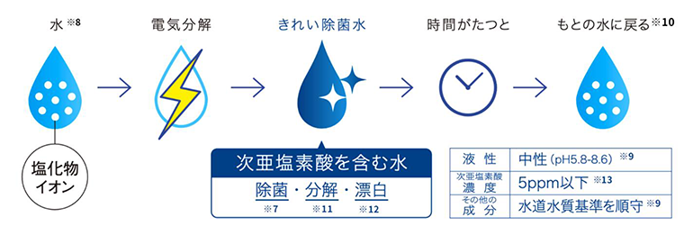 きれい除菌水※7は、水※8に含まれる塩化物イオンを電気分解して作られる除菌成分(次亜塩素酸)を含む水です。薬品や洗剤を使わず、水から作られます。きれい除菌水は安全性の観点から水道水質基準※9の範囲内の濃度で作られており、安全※9で、さらに時間がたつともとの水に戻る※10ので環境に優しいのが特長です。