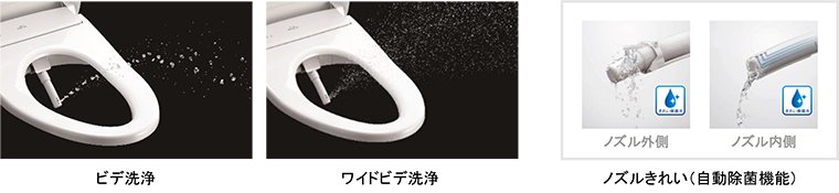 「ウォシュレット」使用前後に水でノズルを洗浄するセルフクリーニングに加え、「きれい除菌水」(次亜塩素酸を含む水)でもノズルの内側・外側を自動的に洗浄・除菌※6します。