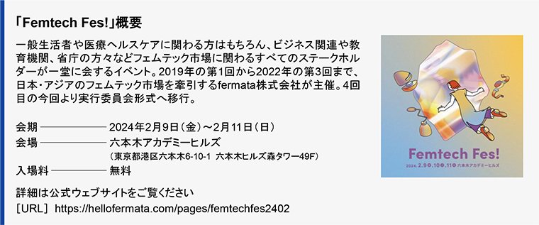 TOTO株式会社(本社:福岡県北九州市、代表取締役社長執行役員:清田 徳明)は、フェムテック商品の展示・体験・交流イベント「Femtech Fes!(フェムテック・フェス)」[会期:2024年2月9日(金)~11日(日)|会場:六本木アカデミーヒルズ(東京都港区 六本木ヒルズ49階)]に初出展します。