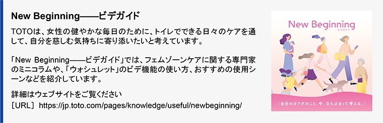 妊娠・出産といったライフステージはもちろん、健康や美容にも大きく影響するフェムゾーンケア。重要なポイントのひとつは洗浄です。TOTOは、40年以上前の1982年よりウォシュレットに「ビデ洗浄」を搭載し、2011年には「ワイドビデ洗浄」を追加することで、その日の気分や体調に合わせた使い分けができるビデ機能を提供してきました。2021年6月より、ビデを通して新しい文化をつくることを目的とした社内組織横断プロジェクト「ビデプラス」を発足し、2022年9月には「New Beginning――ビデガイド」をWEB公開するなど、啓発活動を推進しています。