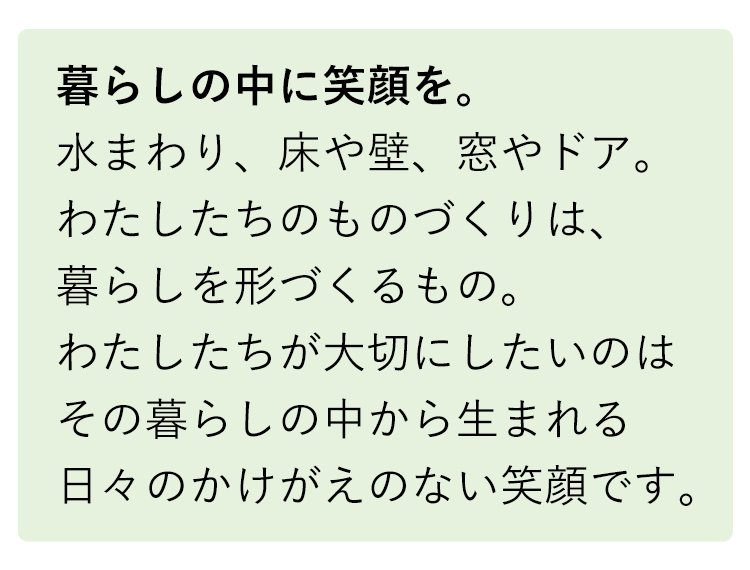 2022年に20周年を迎え、TDY3社でよりお客様の暮らしの価値を向上させるために、アライアンスメッセージを新設し発信しました。お客様一人ひとりの「暮らしの中に笑顔」が生まれることを目指す想いを込めたメッセージです。