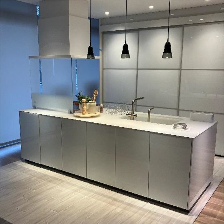 システムキッチン「ザ・クラッソ」は、透明感のあるTOTO独自開発の「クリスタルカウンター」が光を拡散させ、空間を明るく演出。シンプルで凹凸のないデザインは、キッチンとリビングとの美しい調和を実現します。