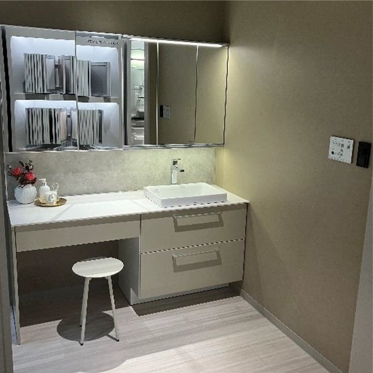 システムドレッサー「エスクア」は、セミオーダー感覚で洗面空間をカスタマイズできる最上級シリーズです。空間に広がりをもたらす「フローティングデザインキャビネット」や、陶器製の「ベッセル式洗面ボウル」、フラットな形状で調色機能が空間を演出する「木製化粧鏡(上下LED)」など、デザインと質感にこだわった上質な洗面空間を演出します。