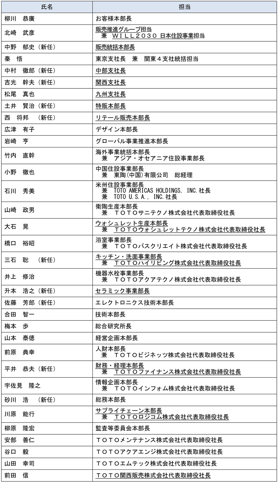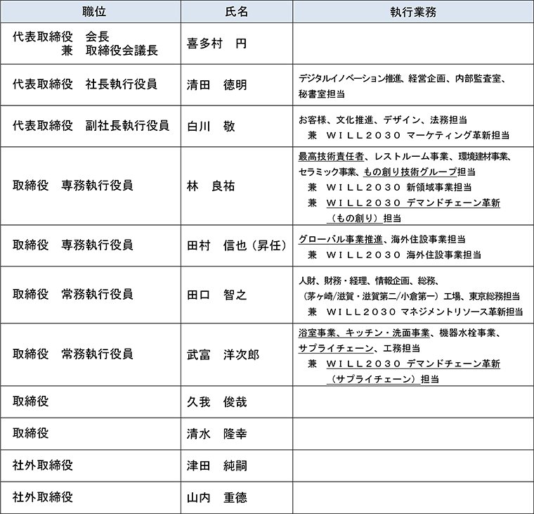 2030年に実現したい暮らしや社会・環境を明確化した「新共通価値創造戦略 TOTO WILL 2030」(以下、WILL2030)は、2024年度よりSTAGE2が始動いたします。2024年4月1日より新体制にて更にスピード感を持って推進してまいります。これに伴い組織改正および職位任命を行います。