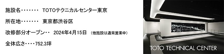 TOTO株式会社(本社:福岡県北九州市、社長:清田 徳明)は、このたび、東京都渋谷区にあるビジネス ユーザー向けの提案施設、「TOTOテクニカルセンター東京」をリニューアルします。