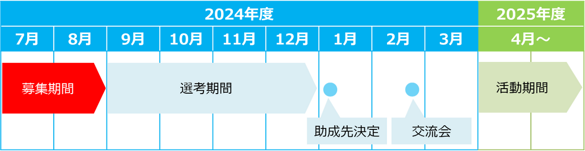 選定した助成先団体の活動、および複数年助成による継続した活動は、一年を通して行っています。助成先団体の募集は年1回です。今回、7月に募集を開始し、3ヵ月かけて選考の上、1月上旬(予定)に結果発表します。