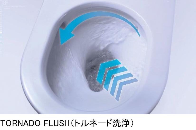 2002年から進化を続けているTOTOの「TORNADO FLUSH」は、渦を巻くような水流により、少ない水で効率的に便器ボウル面を洗浄します。