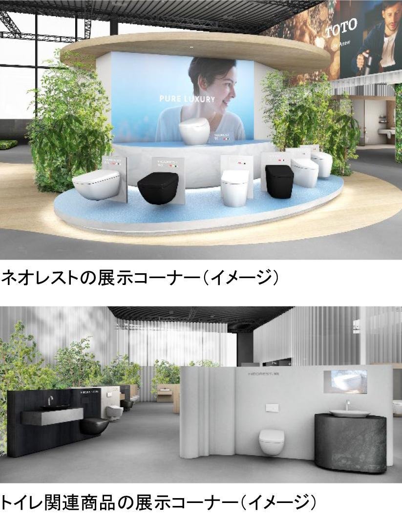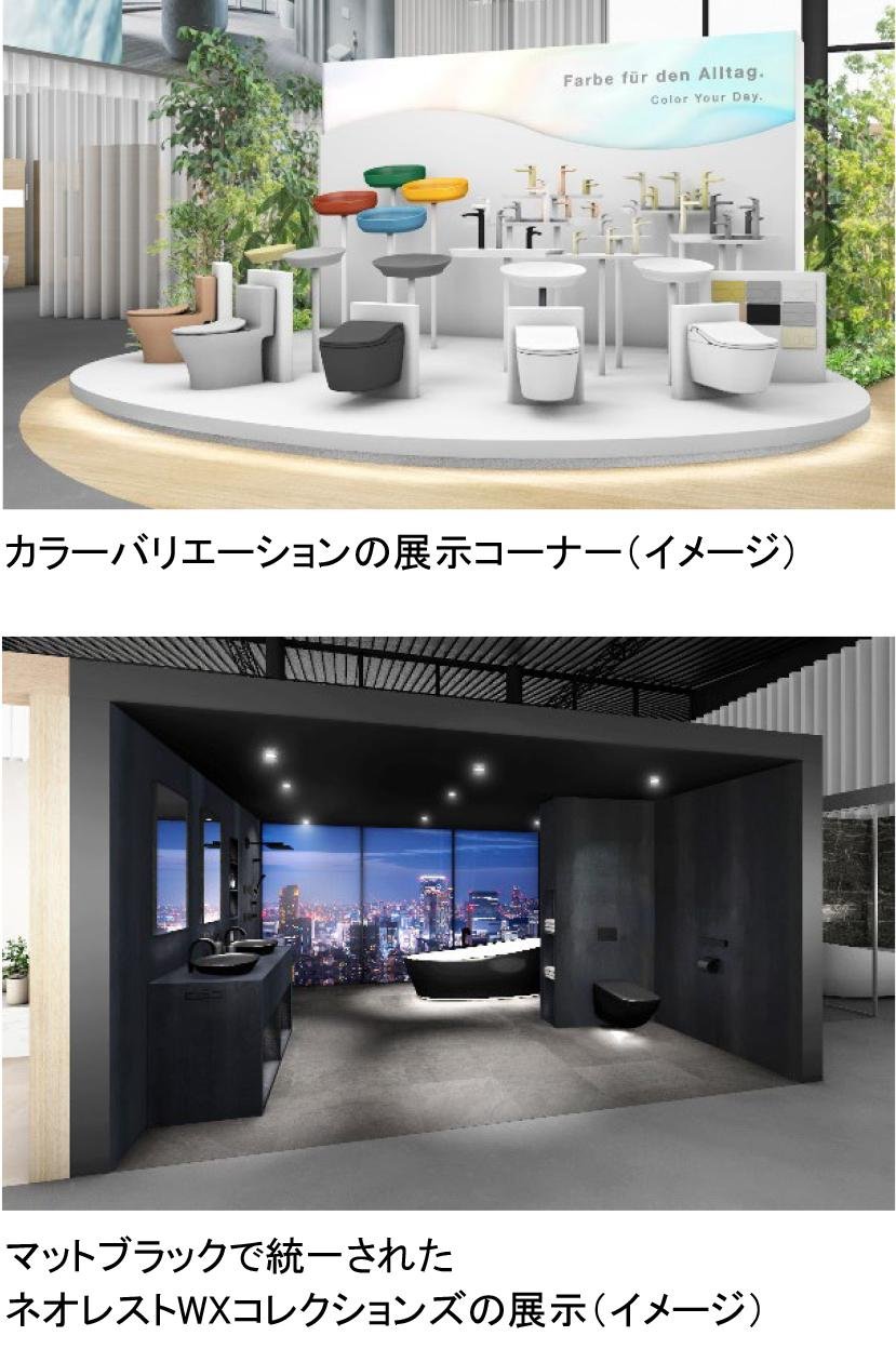 また、トイレ関連商品の展示コーナーでは、欧州で主流の壁掛けタイプの大便器と様々なデザインの温水洗浄便座「ウォシュレット※2」を、洗面器・水栓金具と組み合わせて展示します。