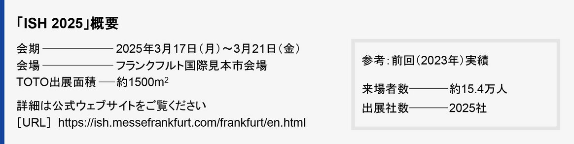 TOTO株式会社(本社:福岡県北九州市、社長:清田 徳明)は、ドイツ・フランクフルトで開催される世界最大規模の国際見本市「International Sanitary and Heating(以下ISH)2025」[会期:2025年3月17日(月)〜21日(金)、会場:メッセフランクフルト]に出展します。